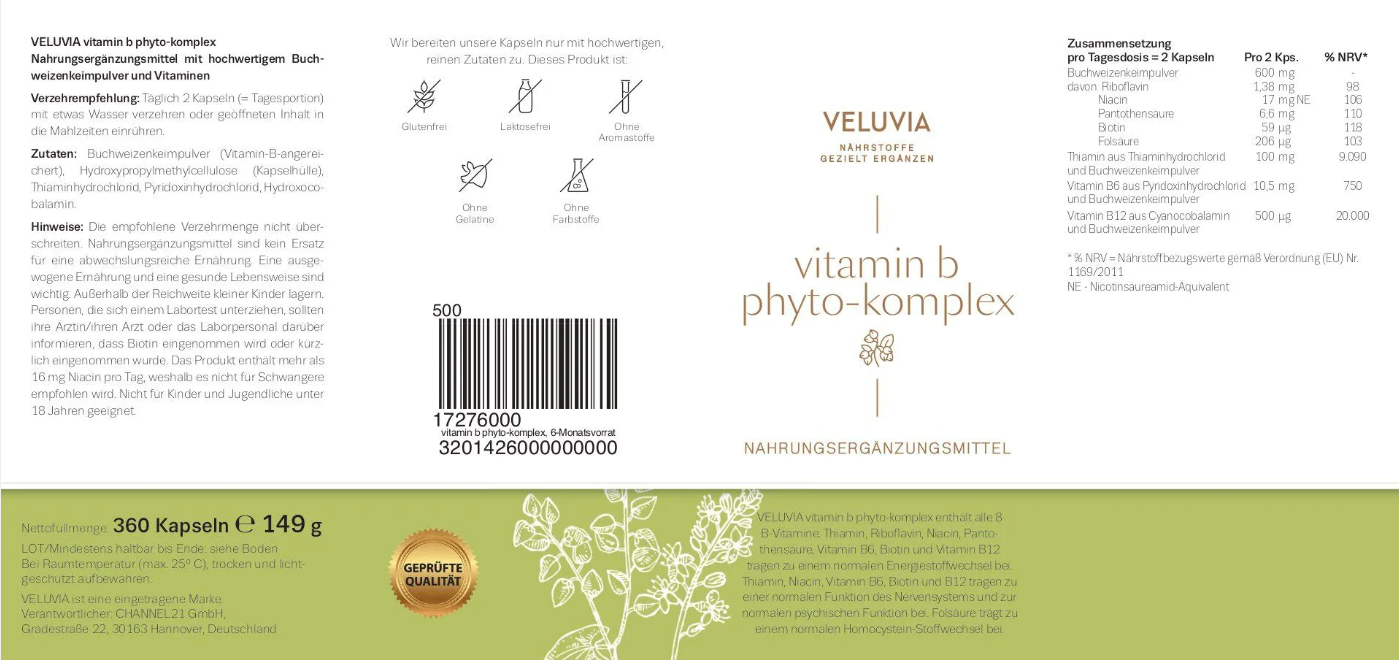 VELUVIA vitamin b phyto-komplex enthält hochwertiges, besonders nährstoffreiches Buchweizenkeimpulver, welches als Quelle für alle acht B-Vitamine dient. Somit ist es möglich, die umfassenden, gesundheitlichen Vorteile dieser Vitamin-Gruppe auf natürlichem Wege zu nutzen. Für eine noch bessere Versorgung kritischer Vitamine enthält die Rezeptur zusätzlich Thiamin, Vitamin B6 und Vitamin B12 in besonders hoher Dosierung.