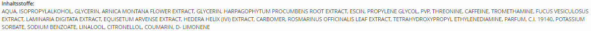 Das schnell einziehende Gel lindert Spannungsgefühle effektiv und verleiht Hautpartien in der Nähe der Gelenke, wie etwa an Knien, Händen oder Füßen, neue Vitalität und Beweglichkeit. Unsere ausgewogene Rezeptur, angereichert mit beruhigenden Essenzen aus Teufelskralle und Rosmarinblättern, versorgt dünnere, gespannte Haut mit Feuchtigkeit und Elastizität. Der hochkonzentrierte Arnika-Extrakt fördert die Regeneration, wirkt schmerzlindernd und verwöhnt strapazierte sowie entzündungsanfällige Bereiche intensiv.